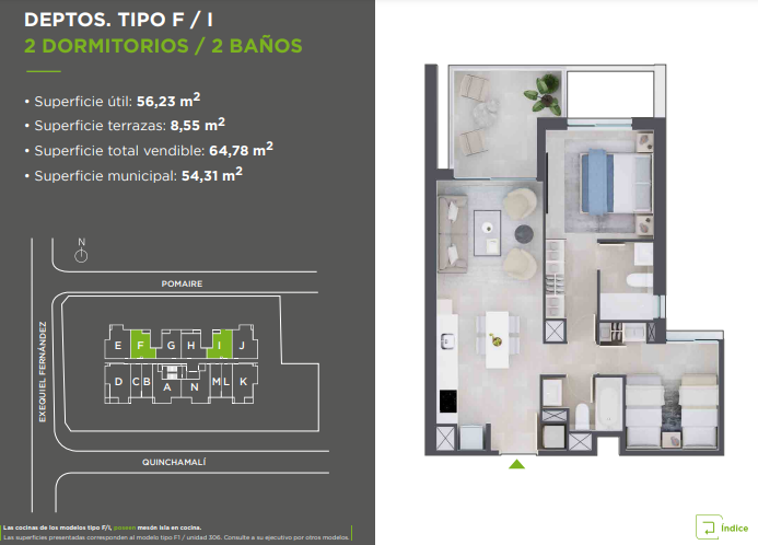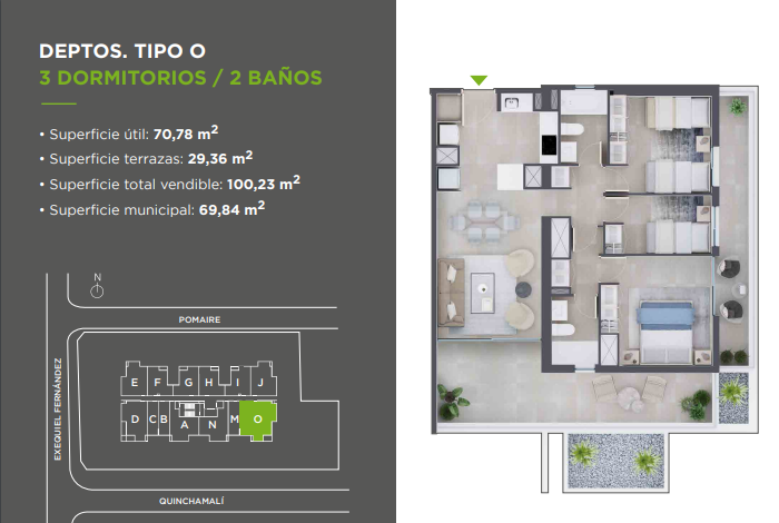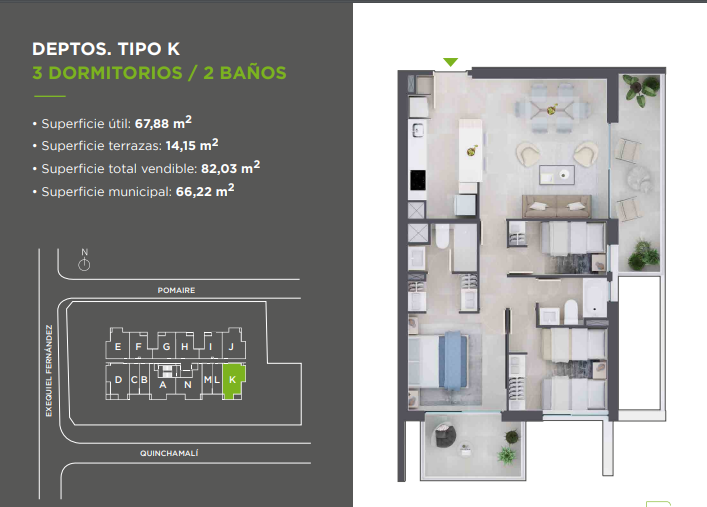 Calefacción por radiadores eléctricos. Puerta de acceso pintada. Ventanas termopanel y marco de PVC. Piso porcelanato en todo el departamento. Cocina de vitrocerámica, horno eléctrico y campana retráctil. Cocina con mesón de granito Muebles vanitorios con